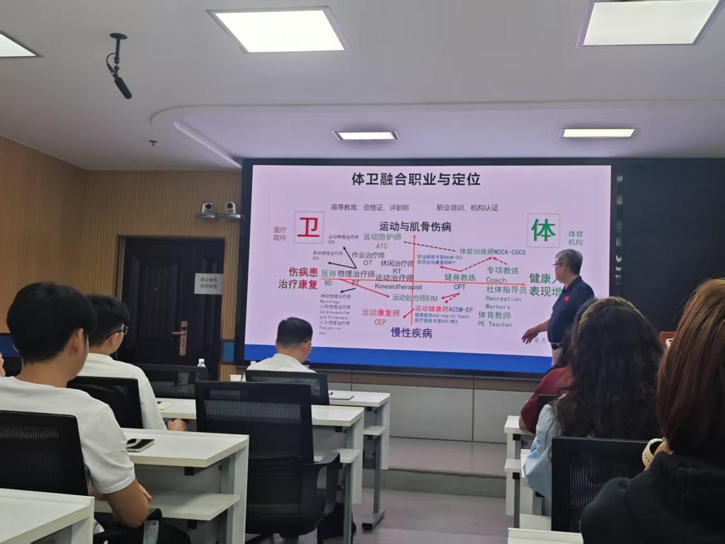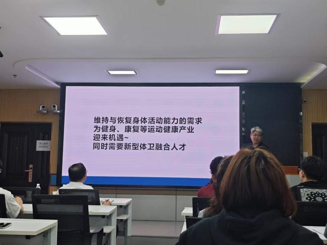 他认为维持与恢复身体活动能力的需求为健身、康复等运动健康产业带来机遇,结合社会需要新型体卫融合人才的实际情况,李教授介绍了体卫融合职业与定位,并且简要介绍了许多体育相关的职业,例如,运动治疗师、健身教练、专项教练等。
