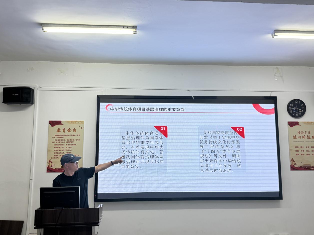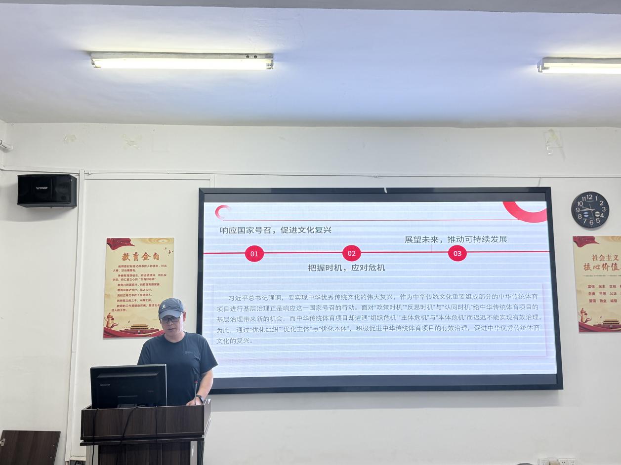 活动中,姜德昆老师从中华传统体育项目基层治理的时机、危机、契机几个方面展开。他首先阐述了中华传统体育项目基层治理作为国家体育治理的重要组成部分,有着展现中华优秀传统体育文化、彰显我国体育治理体系与治理能力现代化的重要意义,《关于实施中华优秀传统文化传承发展工程的意见》与《“十四五”体育发展规划》等政策文件的出台为其如何发展给出了方向指引。